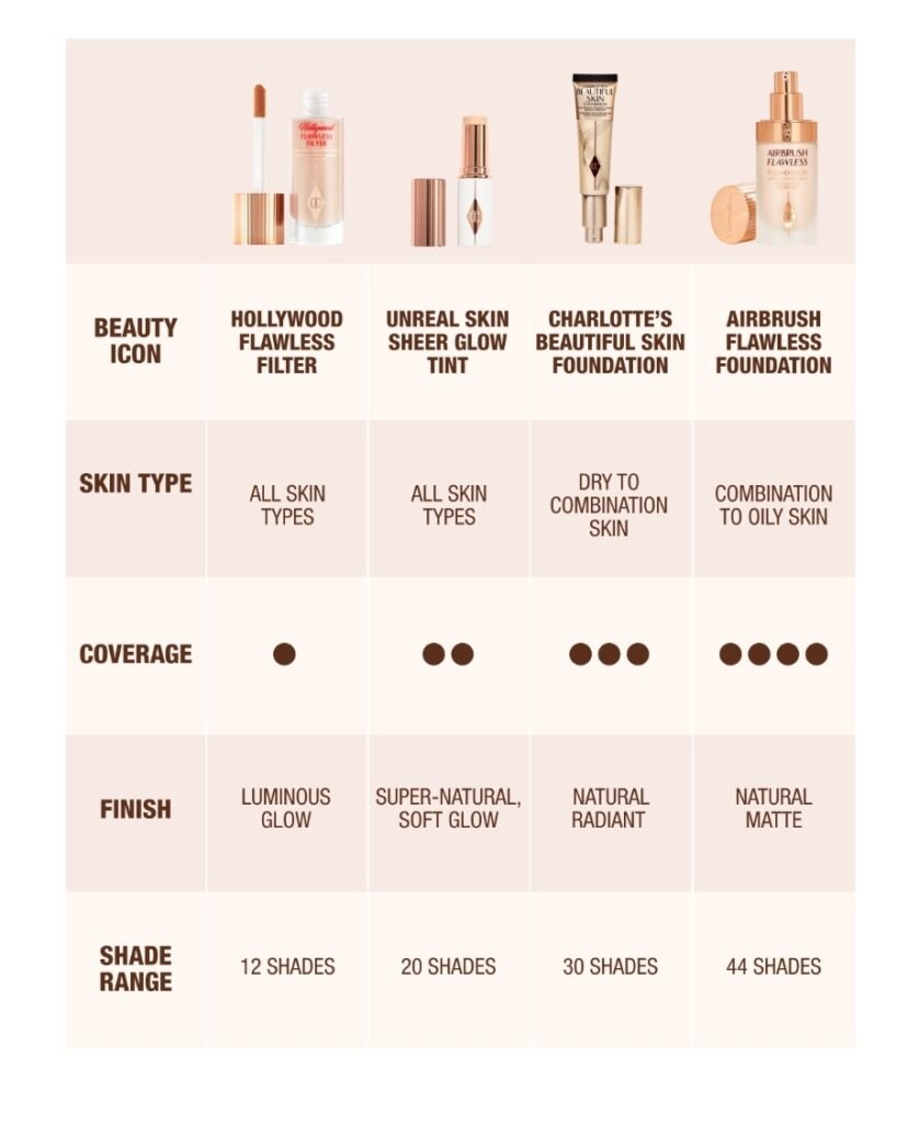 Coverage: This is her Tilbury’s lightweight option, ideal for those who prefer a “no-makeup makeup” look. If you need more coverage, consider the medium build of Beautiful Skin Foundation or the full-coverage Airbrush Flawless Foundation.