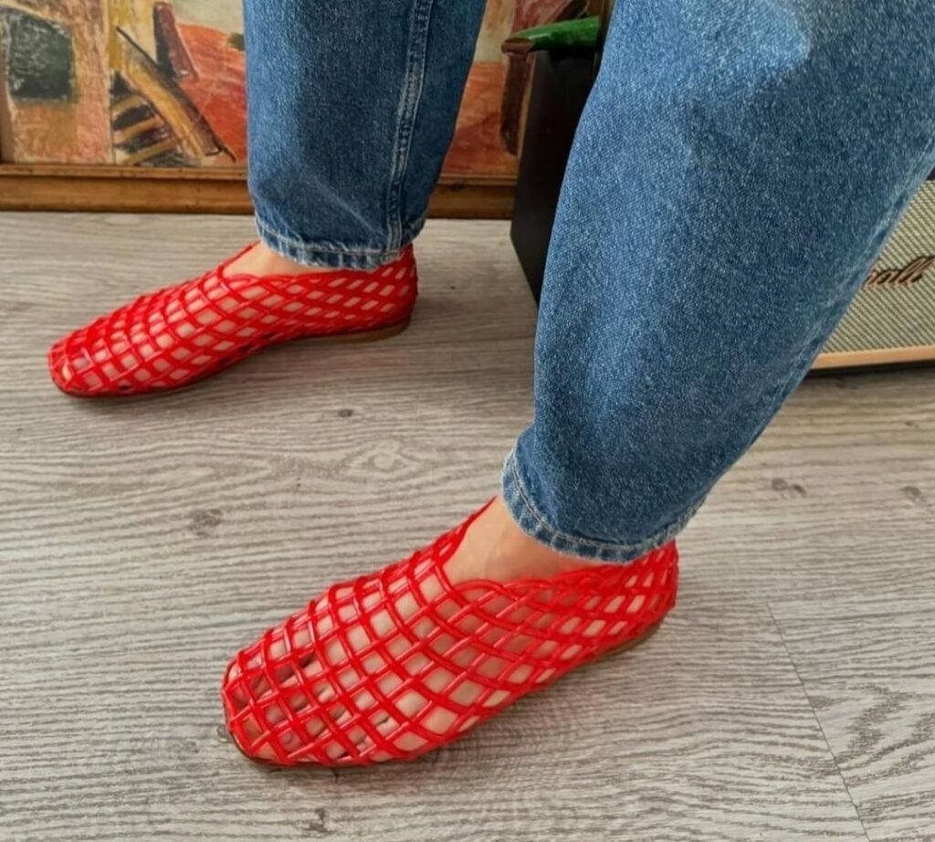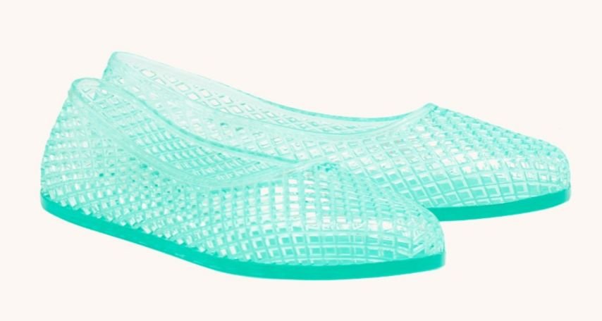 Designer versions have been spotted on celebrities like Jennifer Lawrence, who was seen sporting The Row’s Mara Rubber Mesh Ballerina Flats, a chic and modern take on the classic jelly shoe.