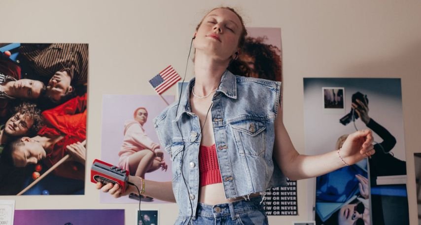 Nostalgic 90s / boy band posters and listening to music on a Walkman