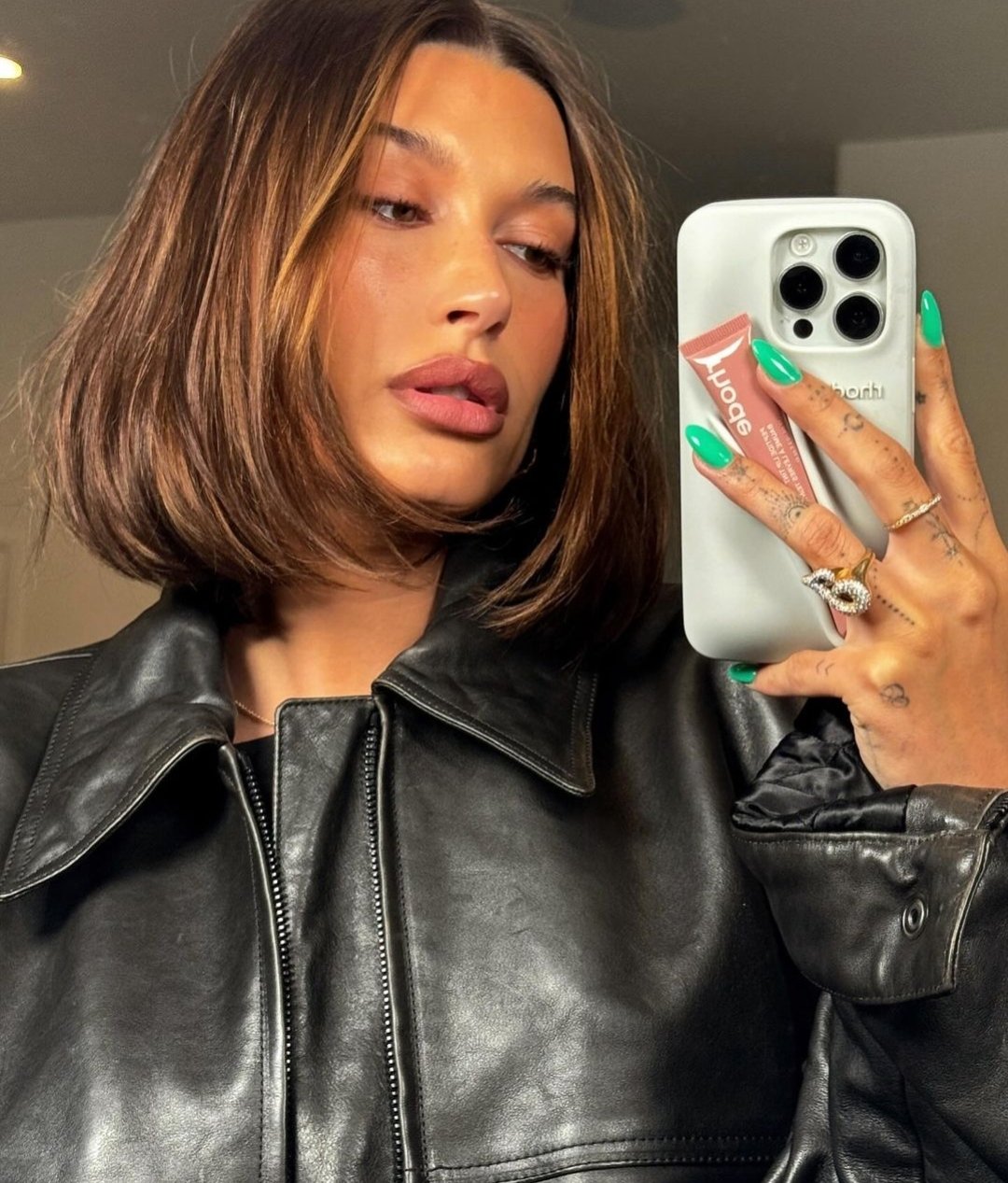 Cool-toned pastels are a major trend this season, and sage green is a frontrunner. This refreshing shade is equal parts calming and eye-catching. It complements both light and dark skin tones beautifully, making it a versatile choice. Hailey Bieber was spotted at Coachella this weekend sporting neon green nails and her ubiquitous Rhode lip case.