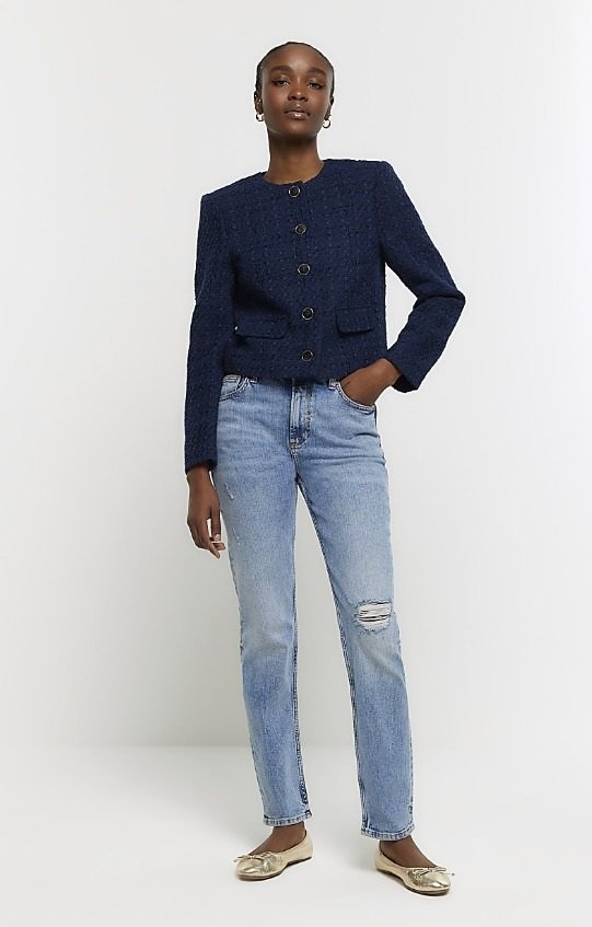 The signature Chanel jacket is crafted from boucle, a textured wool fabric. High-street stores often have tweed jackets that capture that delightfully textured look.
